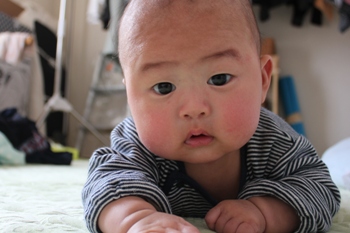 にこーってしてるようで、保育園でも、だんだんと大きい子の中に