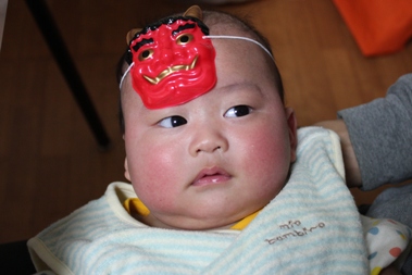 保育園では、豆まきをやったのかな。手にお豆さんを持ってる子を発見。